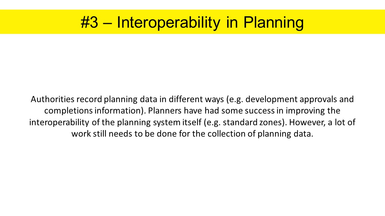 So, for us planners, because we have never been able to share information very easily before we have generally recorded it differently from place to place. It then takes a huge amount of manual effort for anyone who wants to stitch this information together, for example, to see where development has been approved across a metropolitan area. Because of the effort involved, this is information we currently don't have readily available despite the fact it is pretty much essential to do good infrastructure planning.