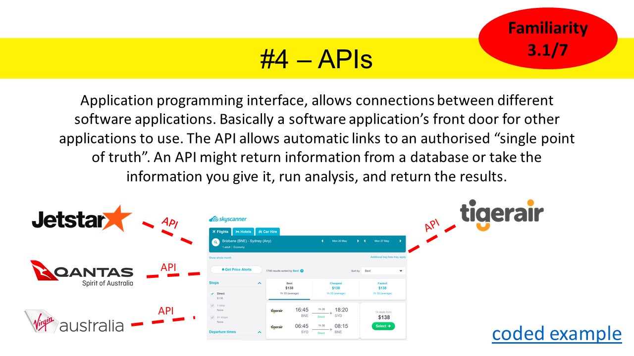 So, we have machine readable information, that is interoperable between all our local authorities. How are we going to access it? My next tech term is API, or application programming interface. You are pretty much only ever going to hear the acronym though. APIs allow for automatic connections between different software applications. Basically, a front door for another software application to visit. I practiced this presentation for some friends who suggested Skyscanner as a good example of an application that uses APIs to give you the most up to date information on flights, but perhaps more relevant to this conference, Neighbourlytics also works by pulling data automatically through the various APIs of social media websites.